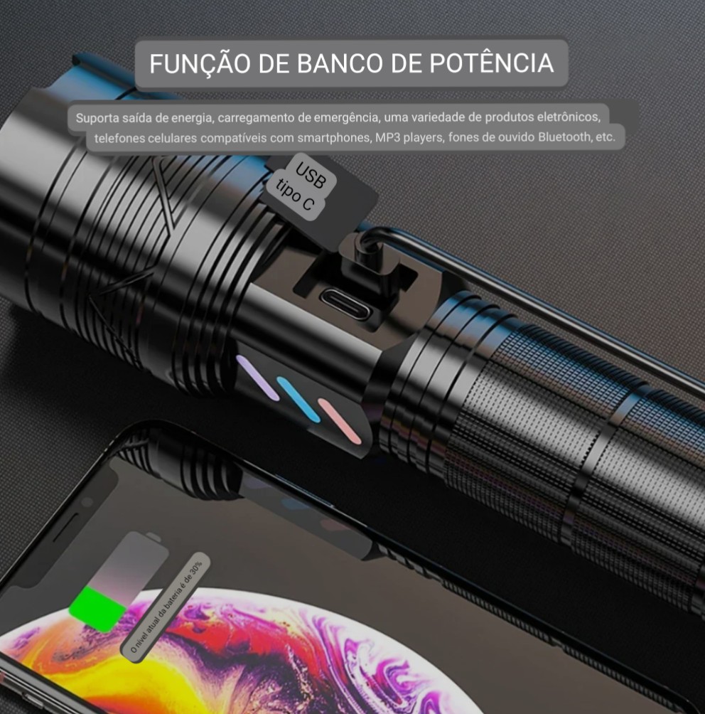 Lanterna tática potente recarregável USB, LED High Lumen, camping, aventura, caça e pesca
